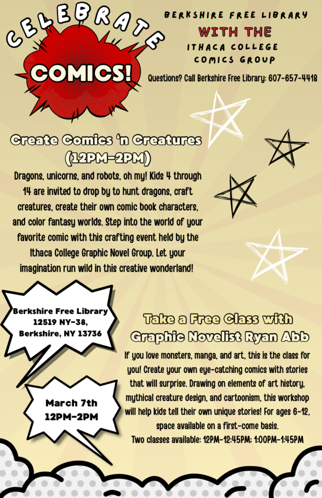 From noon to 2 PM, ages 4-14 are invited to drop by to hunt dragons, craft creatures, create their own comic book characters, and color fantasy worlds! Let your imagination run wild in this creative wonderland!